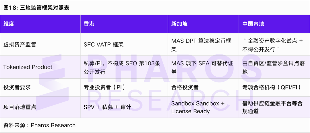 在全球范围内,各主要监管管辖区逐步提出或完善针对代币化资产的监管框架:英国央行(BoE)与欧洲央行(ECB)正在评估将代币化资产纳入可接受抵押品体系,并研究如何扩大可用资产范围;新加坡与香港监管机构继续推进监管沙盒及许可制度,探索如何在保护投资者的同时支持机构发行合规 RWA 产品;美国等地在稳定币与数字证券法案方面也在推进相关立法,为成熟 RWA 提供更清晰的法规边界。尽管各地监管环境仍存在差异,例如中国监管机构曾建议暂停部分在港开展的 RWA 活动以审慎评估风险,但全球监管整体趋势仍趋于明确和可预期。
