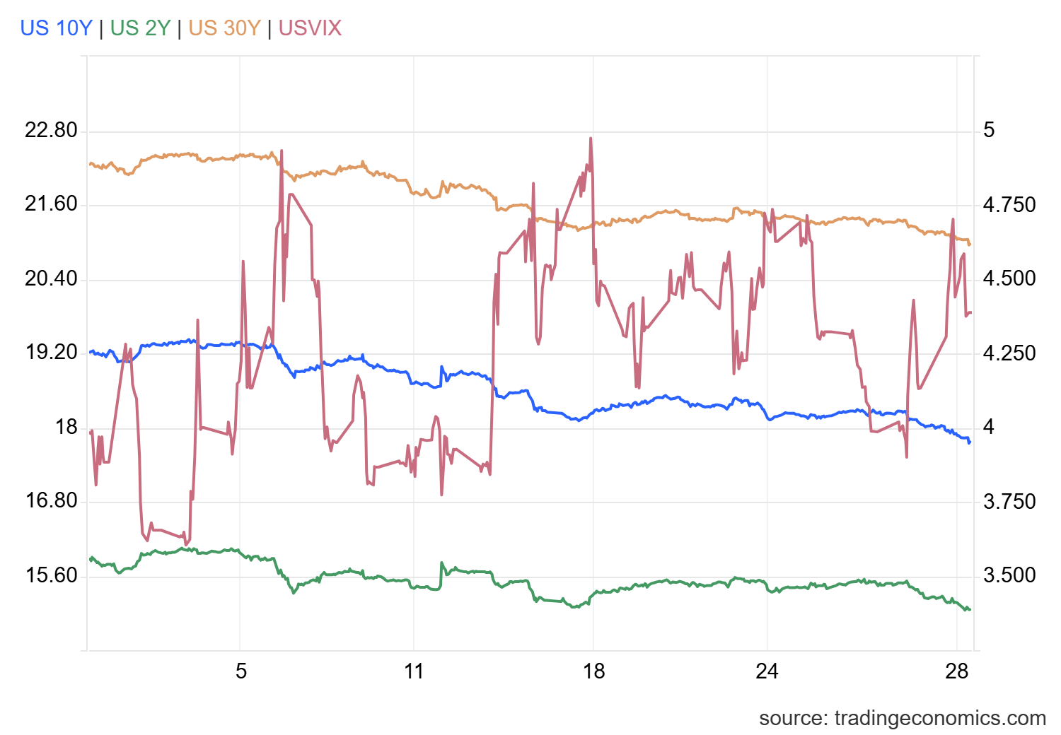 a. 在财政赤字高企、降息预期变化不大的背景下,VIX 上行 叠加 2Y、10Y、30Y 收益率同时下行,更可能由避险资金流入及经济增长预期走弱驱动,而非政策路径出现实质性转向;