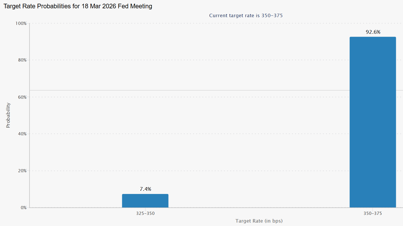 a. CME 数据,3 月维持利率不变的概率稳定在 90% 以上,市场普遍预期美联储将在至少未来两月内保持政策静止,等待通胀数据进一步确认下行趋势;