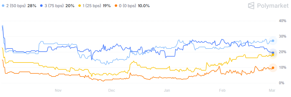 b. 地缘局势升温推高避险需求 + 能源价格上行影响通胀回落的背景下,市场正在压缩对大幅降息(75bps)的定价空间,同时将降息预期收敛至更为克制的温和路径(25 – 50bps);