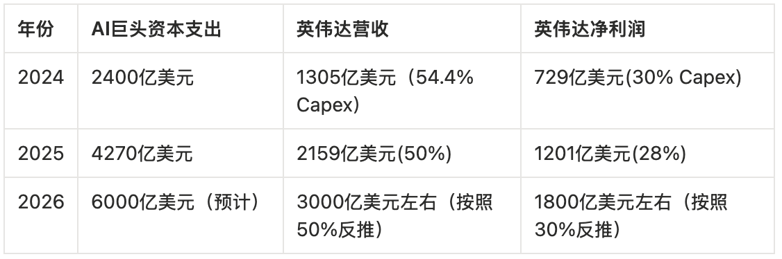 1. 毛利与生态抽成(“30% 定律”):英伟达的净利润,基本上占到了美股巨头 AI 资本总支出(CapEx)的 30% 左右。按照 6000 亿美元的预计资本支出,则英伟达 2026 年净利润将到达 1800 亿美元。