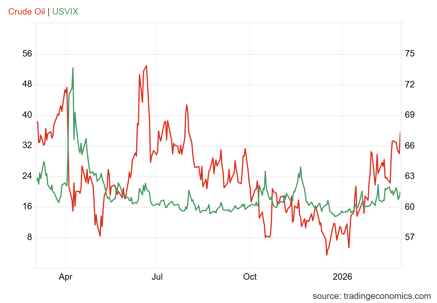 a. WTI 原油、VIX 在 2026 年以来均呈现震荡上行走势,两者同步走强的情况下,油价上涨更多由风险溢价与供给扰动驱动;