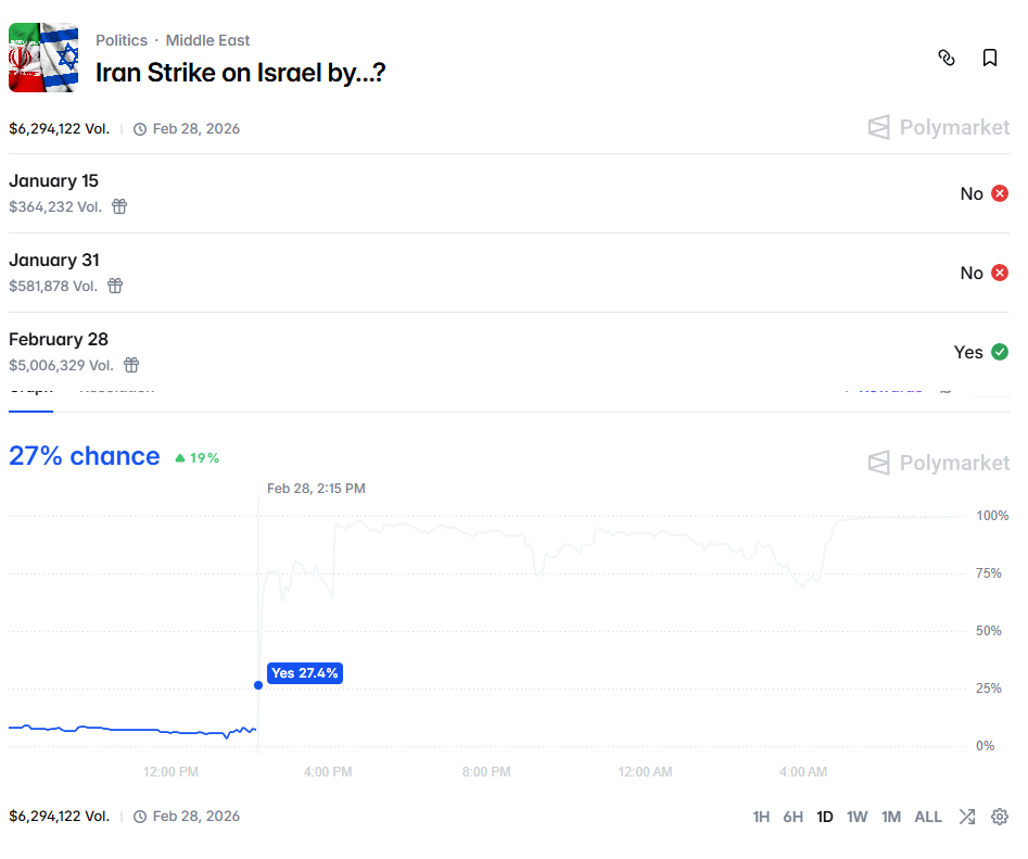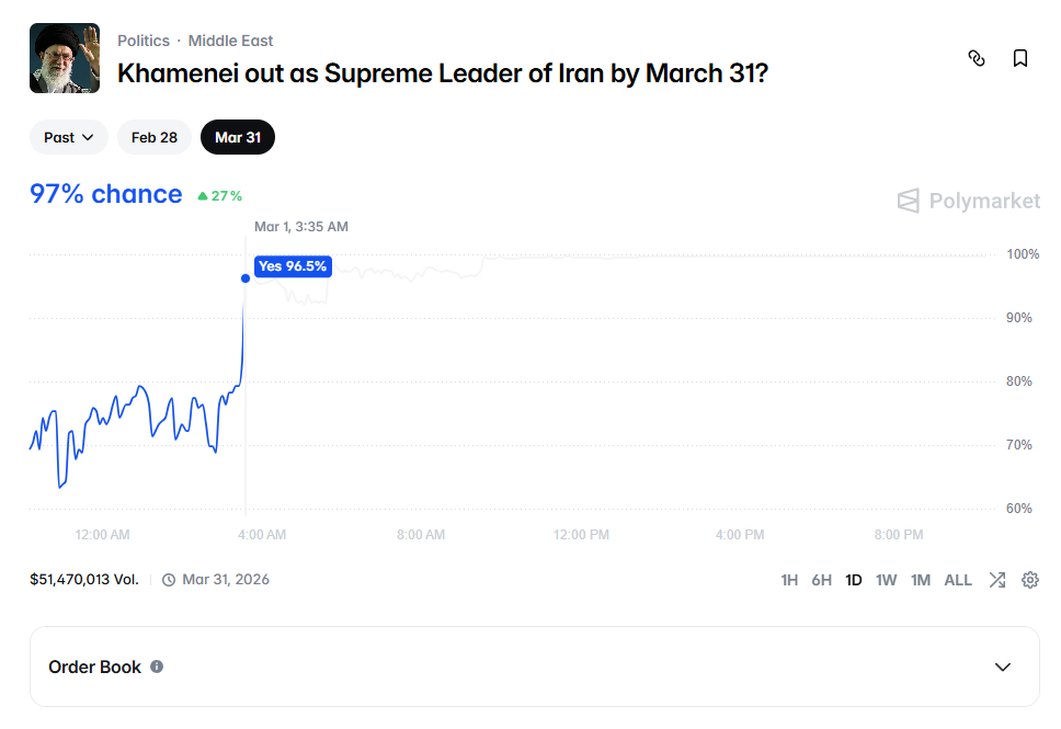 b. 说到预测市场,因为有预测市场的存在,信息定价开始逐渐被人重视,类似 polymarket 这种公开 sell 信息的平台开始出现替代热点新闻的属性,并且从及时性角度来看,通过 polymarket 的赔率反而能比新闻更早一步判断事情的进展。以哈梅内伊遇害的新闻为例,根据新闻源的不同,市场新闻普遍在 4 点左右开始出现类似报道,直到 5:30 左右 Trump 才在 Truth 平台发布称哈梅内伊在袭击中身亡。包括 2/28 日以色列袭击伊朗的事件中,以色列国防部长在 2:15 发布公告称对伊朗发起防御性打击,同时 polymarket 对应盘口出现斜率飙升。在信息为王的时代,通过监控信息定价相较传统新闻监控可以获取更快速的信息资源。