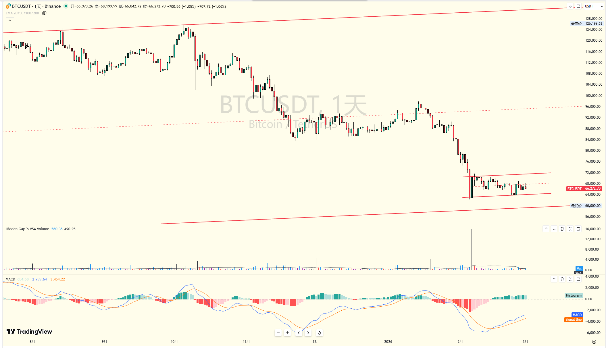 a. 上周对市场判断会长期筑底,短期向下走到 65000 以下,实际价格目前仍遵循在日线级别的通道当中,受地缘政治预期的影响,周二 BTC 下探最低来到 62500 附近后拉升,随后因美股 circle 大涨,BTC 也出现跟随。当前对币价的看法仍然不变,即短期市场反弹可能性较低,叠加美股本周可能受战争及霍尔木兹海峡关闭等影响受挫,对币市也会有一定打击,短期市场仍然会下跌,任何反弹动作都是比较好的做空点位,比如上周三类似的情况。