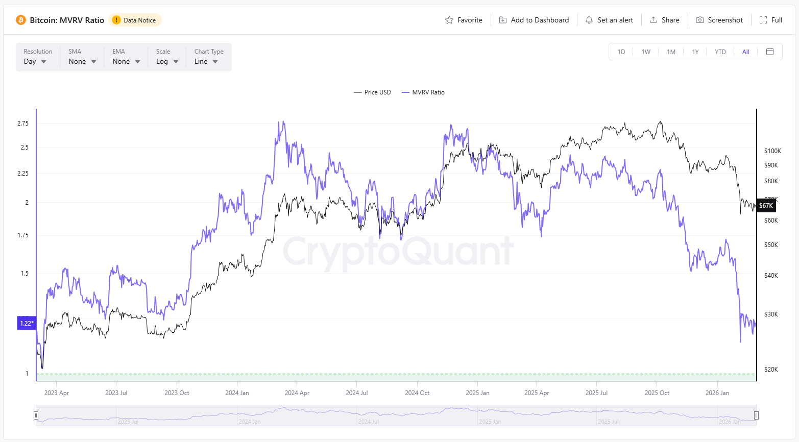 c. 熊市通过看 MVRV 可以判断是否是值得定投的位置,MVRV 可以简单理解为 MV=全市场流通市值,与 RV=全市场平均成本的比值,当 MVRV 低于 1 可以被视为市场底部,MVRV 当前维持在 1.22 附近,MVRV 低于 1 代表市场底部,说明当前市场仍未触底。