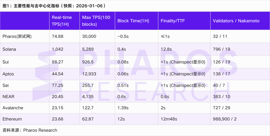 为了尽量避免口径不一致导致的伪比较,本文对性能类指标采用 Chainspect 的统一展示口径(如 1 小时窗口的 TPS、100 blocks 的 Max TPS、出块时间与最终性),对资产与交易活动采用 DefiLlama 的链维度面板口径。考虑讨论度、生态活跃与路线差异,本文选择 Solana、Sui、Aptos、Sei、NEAR、Avalanche、Ethereum 为主要对照。Ethereum 作为安全与去中心化基准,其余链代表当下高性能与新架构方向。对比指标与数据源主要包括:吞吐(Real-time TPS / Max TPS)、区块时间、最终性、验证者数量、Nakamoto 系数与平均交易费,主要来自 Chainspect 在 2026-01-06 的页面快照。[6]-[12] Pharos 尚未被同源仪表盘全面追踪,本文对其在图表中的性能点采用公开披露。[4][5][13] 各类指标含义可以参照附录。