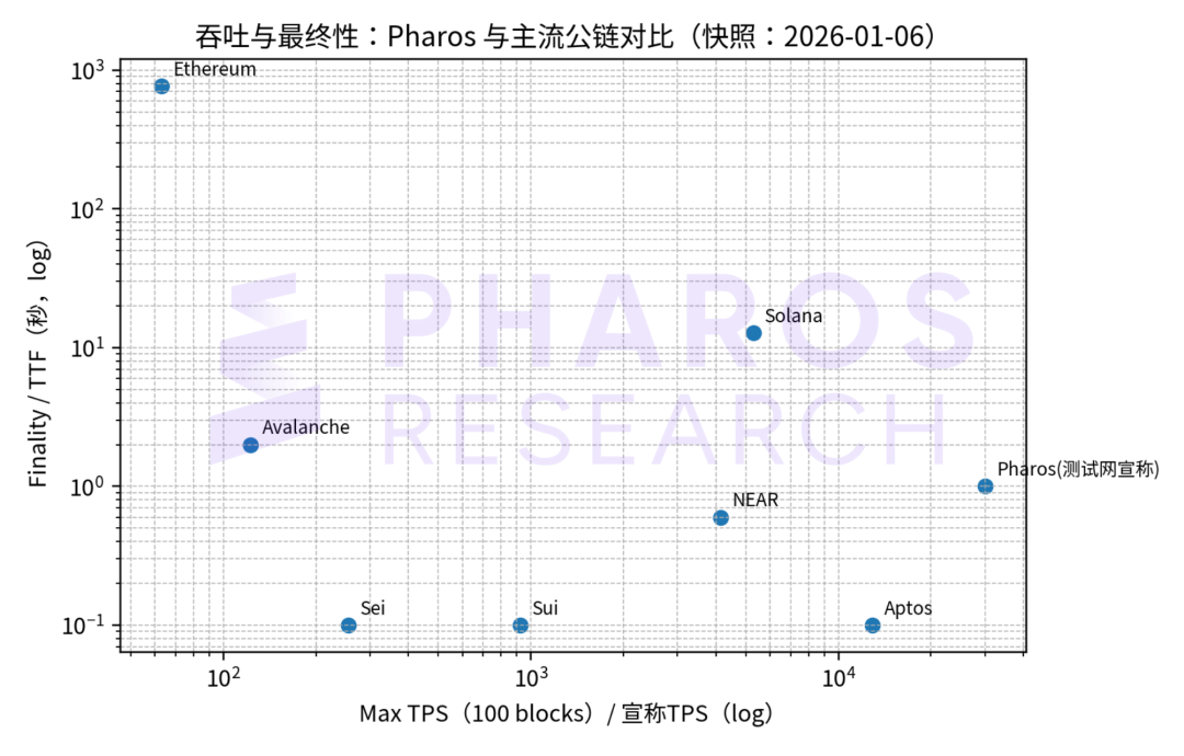 本章的横向对比不是做公链排行榜,而是回答机构在评估一条新链时最常问的六个问题:它的确定性结算能否支撑支付与清算?它的数据层与索引成本能否长期可控?它的安全边界是否能被风控条款化?它对现有开发与审计体系是否友好?它是否为合规、隐私与专用计算预留了系统级接口?以及当业务规模上来时,是否仍能保持可预测的运行曲线。因此,我们把 Pharos 放回性能 × 确定性 × 可运营性的坐标系里,并以 Solana、Sui、Aptos 与 Ethereum 作为参照系,用同口径数据建立客观比较,再回到 Pharos 的工程抓手解释为什么。