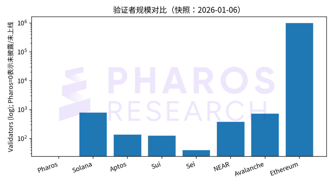 图 3:验证者规模对比(对数坐标;Pharos 为测试网数据)