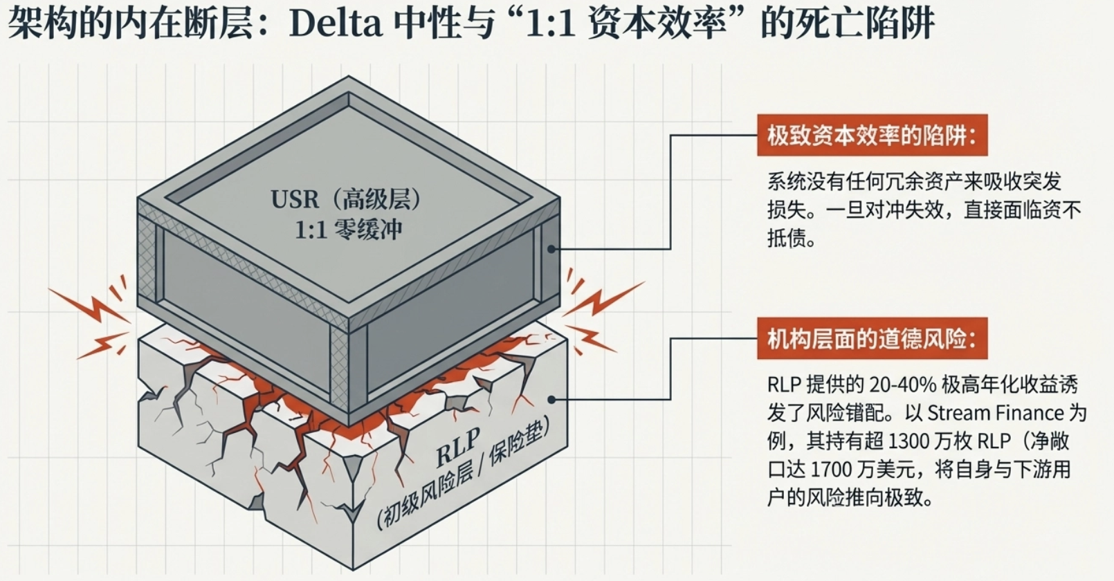 然而,这种设计的内在矛盾在于:它将加密原生的去中心化资产与中心化交易所的衍生品市场深度绑定,引入了复杂的对手方风险和操作风险,而“1:1 的资本效率”意味着系统没有任何缓冲垫,一旦对冲机制失效,系统将直接面临资不抵债的绝境。