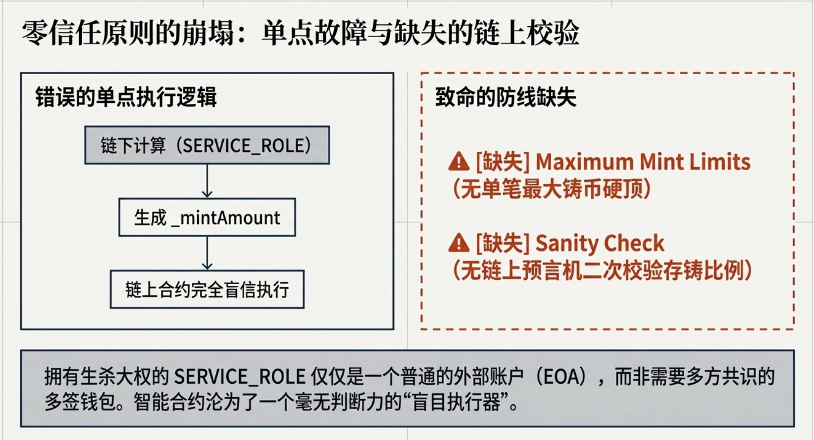 问题的核心在于,铸造合约完全盲目地信任了由 SERVICE_ROLE 提供的 _mintAmount 参数。合约代码中既没有设置单笔最大铸造数额的硬性上限,也没有在链上再次调用预言机对存入金额与铸造金额之间的比例进行合理性检查。