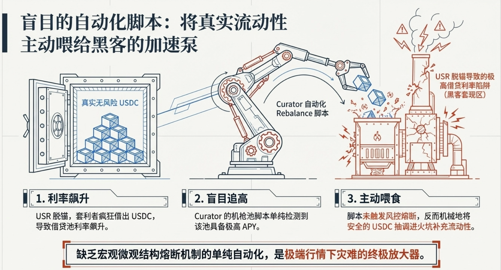 然而,当攻击发生后,套利者在 USR 脱锚后以折价买入,再把它抵押进协议。由于协议内部预言机仍以 1 美元计价,套利者用这个价差借出真实的 USDC,导致 USR 市场利用率瞬间爆表。此时,Gauntlet 等机构的自动化金库检测到了“高收益信号”,却不知道那是一个“有坑”的市场,于是开始源源不断地往里注资: