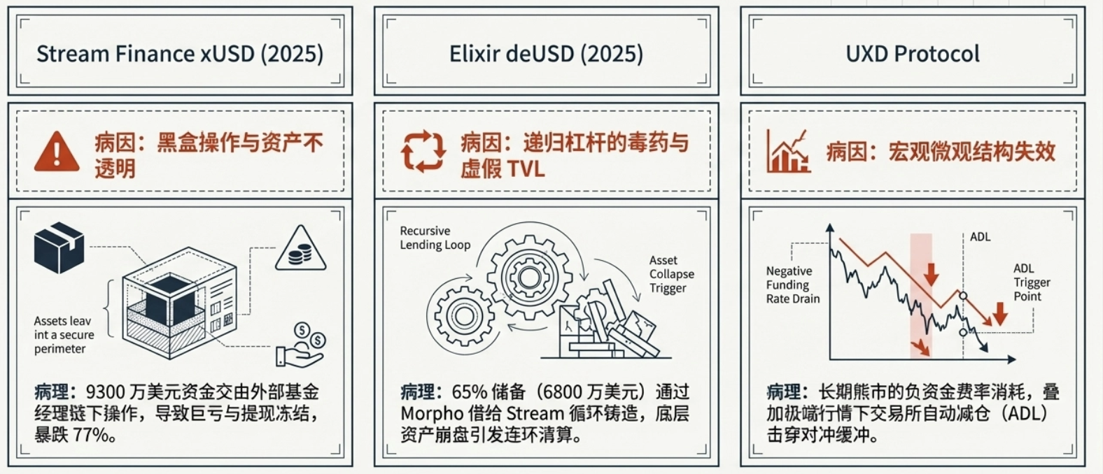 进入 2025 年,随着借贷协议“策展人模型”的流行,生息稳定币的风险形态发生了演变,从单点崩溃升级为系统性传染。2025 年 11 月,Stream Finance (xUSD)、Stable Labs (USDX) 与 Elixir Network (deUSD) 发生的连环崩盘,是这一模式的典型代表。
