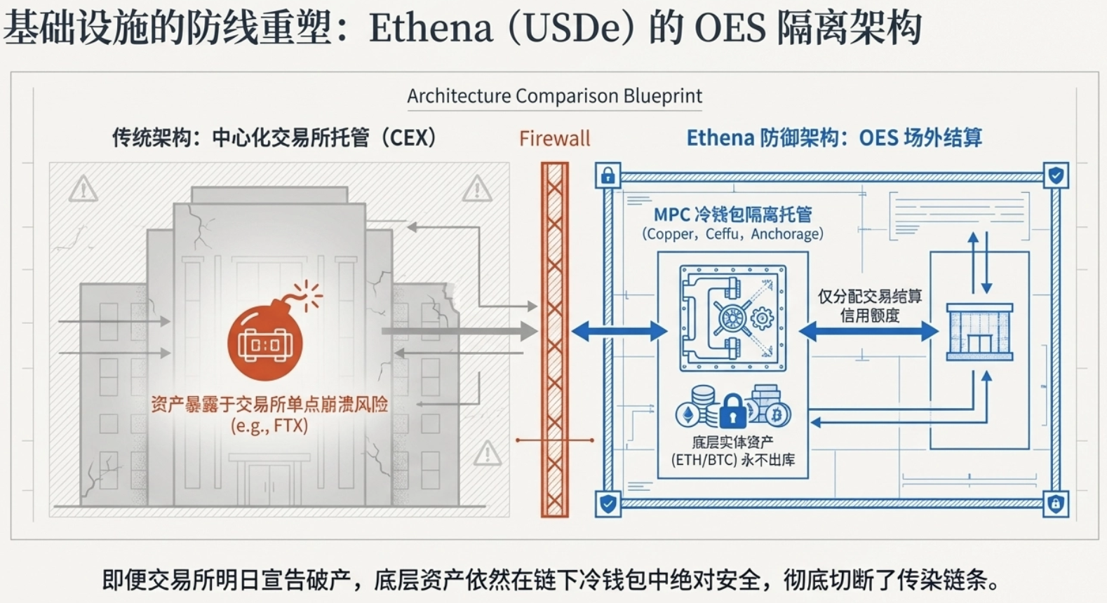 Ethena 破局的关键在于引入了场外结算架构。USDe 的底层抵押资产(ETH/BTC)并不存放在币安或 OKX 等交易所内,而是由受严格监管的第三方机构(如 Copper、Ceffu、Fireblocks 以及 2025 年底加入的 Anchorage Digital Bank)进行 MPC 冷钱包托管 。