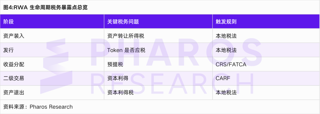 对于 RWA 项目而言,这种监管边界迁移具有直接而深远的影响。RWA 并非单纯属于传统金融或加密资产领域,而是同时连接链下资产结构、链上 Token 结构以及跨境投资人网络。正因如此,其运行过程天然跨越账户体系、资产体系与交易体系三个层面,使得项目更容易同时落入 CRS、FATCA 与 CARF 的交叉监管范围。也正是在这一制度背景下,RWA 项目在资产装入、Token 发行、收益分配以及二级市场流通等环节中,逐渐显现出一系列此前在传统金融产品中并不突出的税务暴露点。理解这一监管边界迁移,是分析 RWA 税务风险结构的前提。只有将项目放入这一新的监管坐标系之中,才能解释为何某些看似技术性的结构设计,会在跨境税务层面触发新的合规义务。基于此,下一部分将从 RWA 的全生命周期出发,系统梳理其在资产装入、发行、持有与流通各阶段中可能出现的关键税务暴露节点。