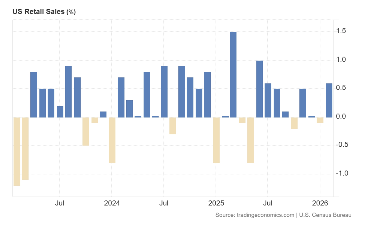 a. 2 月美国零售销售环比增长 0.6%,高于市场预期得 0.5% 及前值得 -0.1%,为近 7 个月最强表现。消费韧性仍在、内需动能稳健;