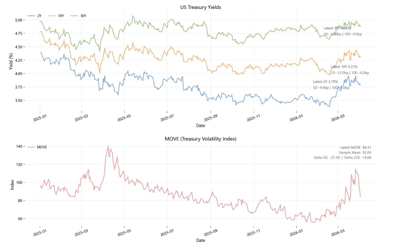 a. 短端与长端收益率周内小幅回落(约 8–13bp),且 MOVE 显著回落,利率波动短期降温但仍处中性偏高区间;