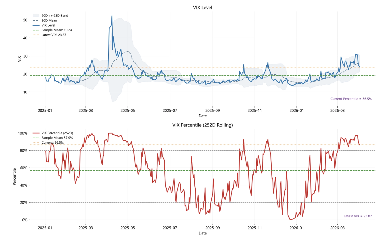 a. VIX 维持在 23 - 24 的高位区间 + 252D Rolling 处于 86% 分位,VIX 未进一步恶化,市场当前处于“高波动但非恐慌”阶段,期权对冲成本仍偏高;