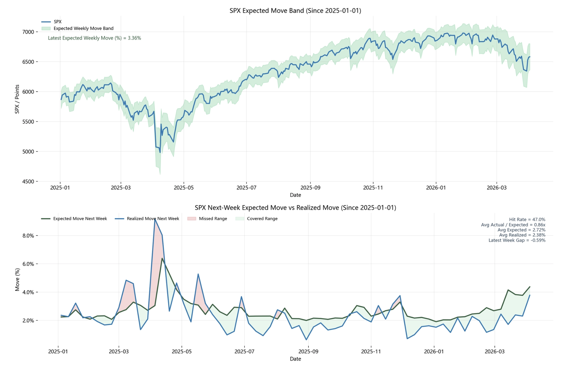 b. 根据 Latest VIX 数据,SP500 未来一周预期波动为 ± 3.36%,隐含波动率自 2 月以来持续高于实际波动率,卖方波动率策略有优势;