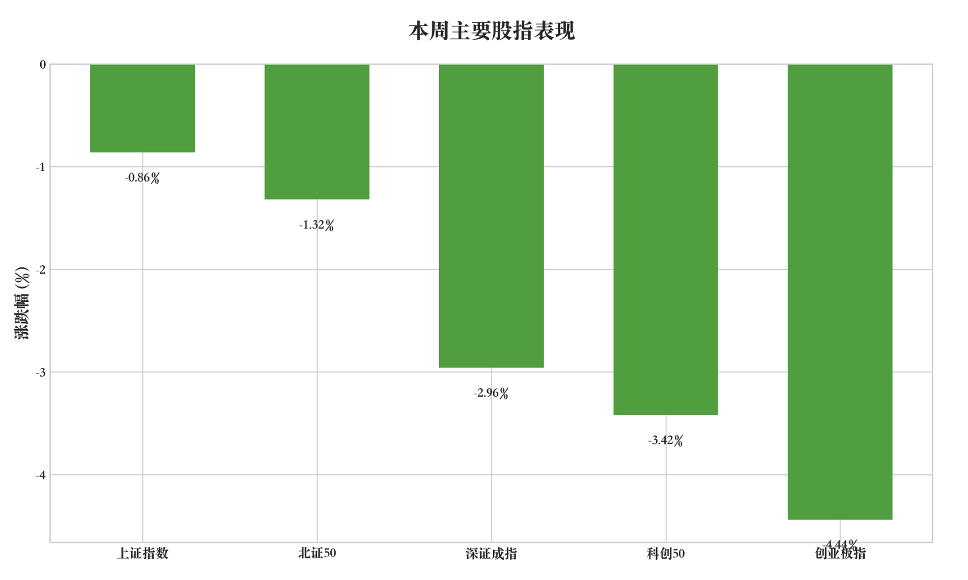 i. 指数表现:本周五大指数全线下跌,上证指数 -0.86% 相对最强,北证 50 -1.32%,深证成指 -2.96%,科创 50 -3.42%,创业板指 -4.44% 最弱,市场呈现成长风格调整更深、权重指数相对抗跌的格局。