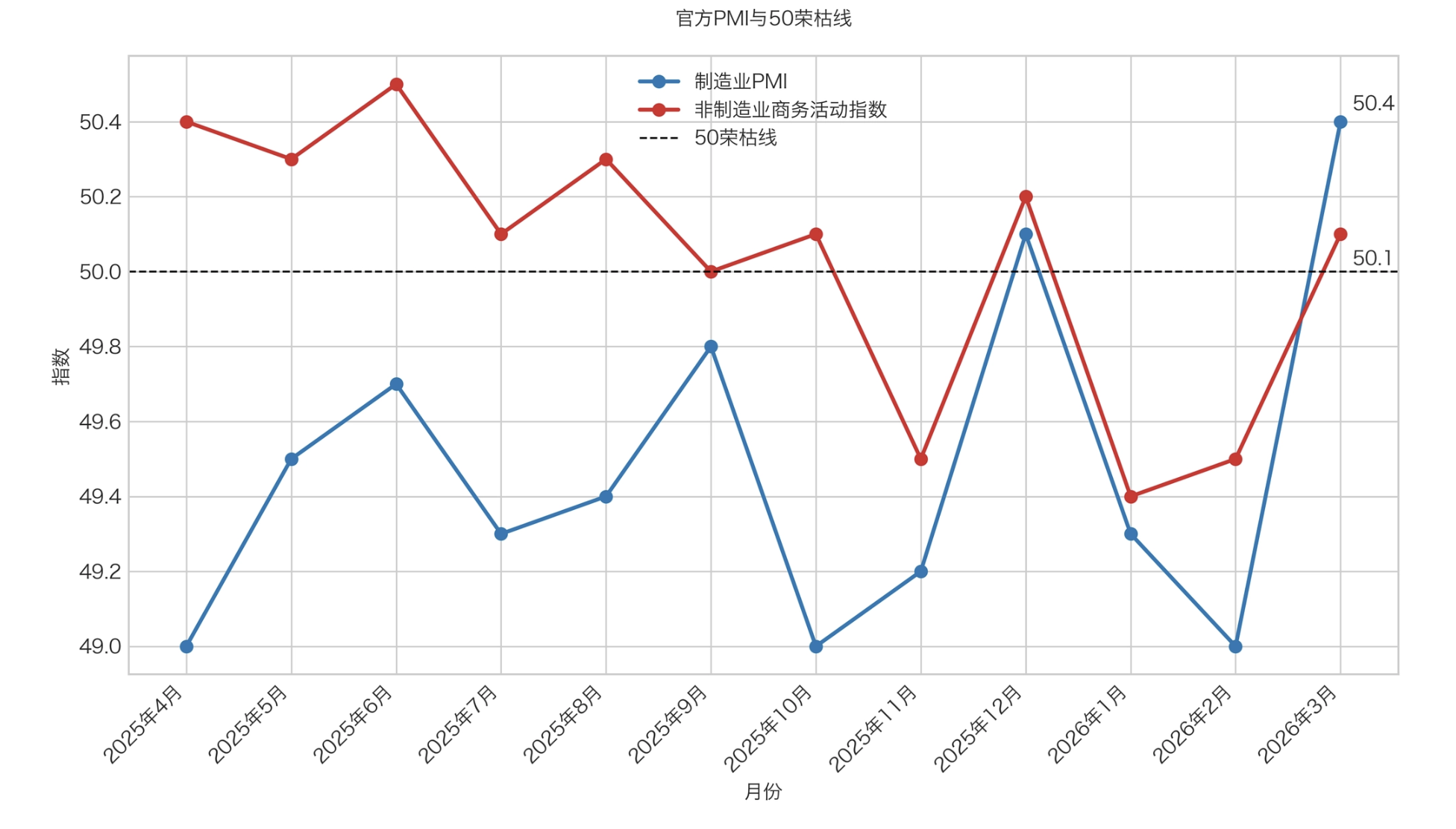 ii. 宏观经济数据跟踪: 本周新增的核心宏观数据只有 2026-03-31 发布的 3 月 PMI。制造业 PMI 从 49.0 回升到 50.4,重新回到 50 荣枯线之上;非制造业商务活动指数从 49.5 回升到 50.1,同样回到扩张区间。