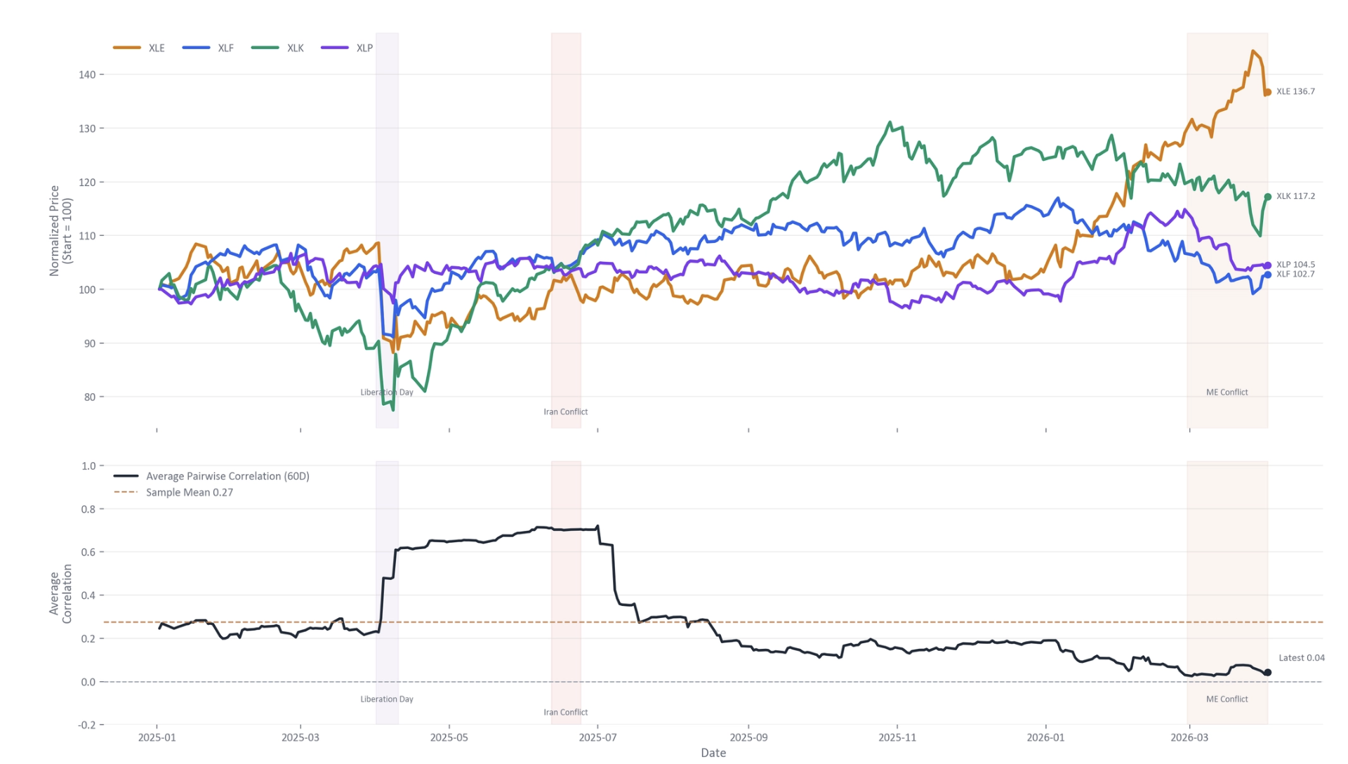b. 能源板块(XLE)自高位明显回落,科技板块(XLK)低位反弹走强,金融(XLF)仍偏弱、防御(XLP)相对平稳,60 日平均相关性维持在极低水平(~0.04)附近,未见明显回升;