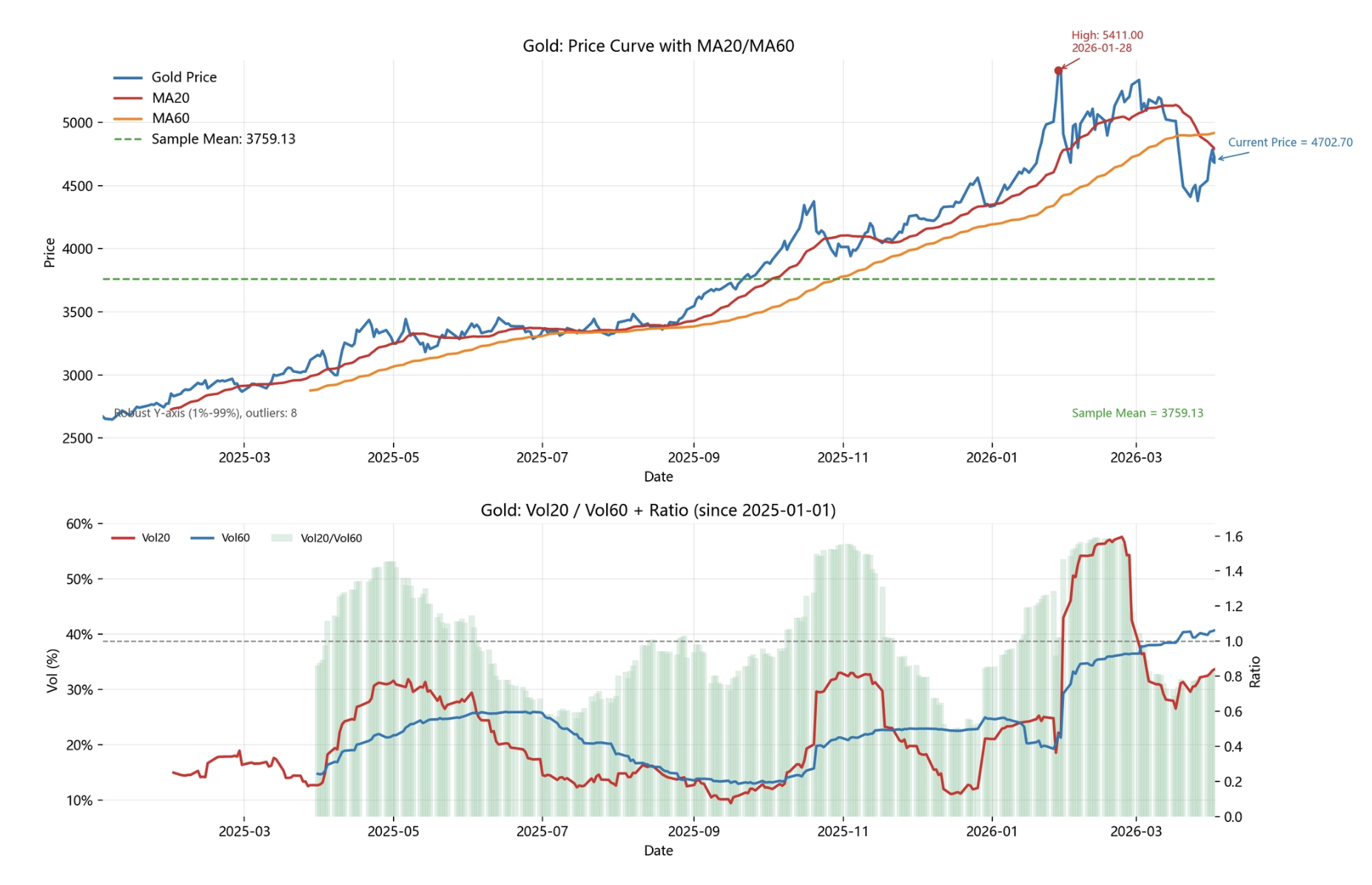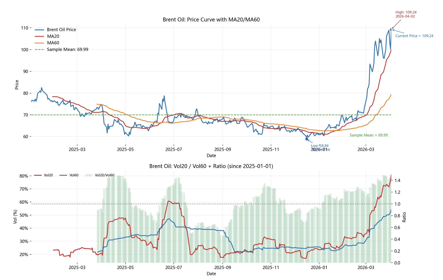 a. Brent 最新升至 109.24,并刷新阶段新高,价格显著高于 MA20 和 MA60。同时, Vol20 明显高于 Vol60,且 Vol20/Vol60 ratio 升至 1.4 – 1.5 附近,地缘风险溢价仍在继续定价;