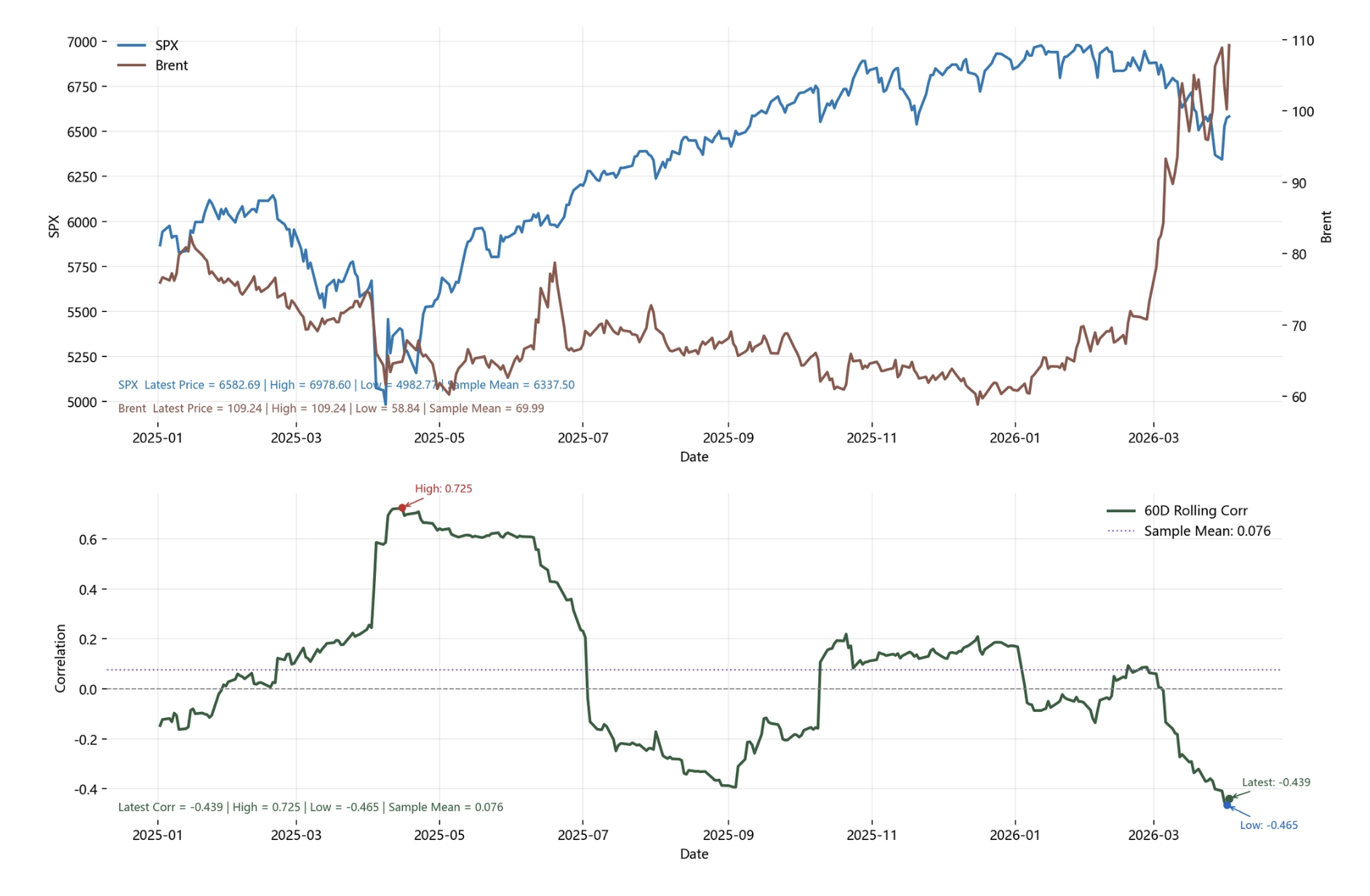 b. SPX 与 Brent 60 日滚动相关性降至 -0.439,处于样本期内的低位水平,油价不再被市场视作增长修复信号,而被定价为对通胀的压制因素;