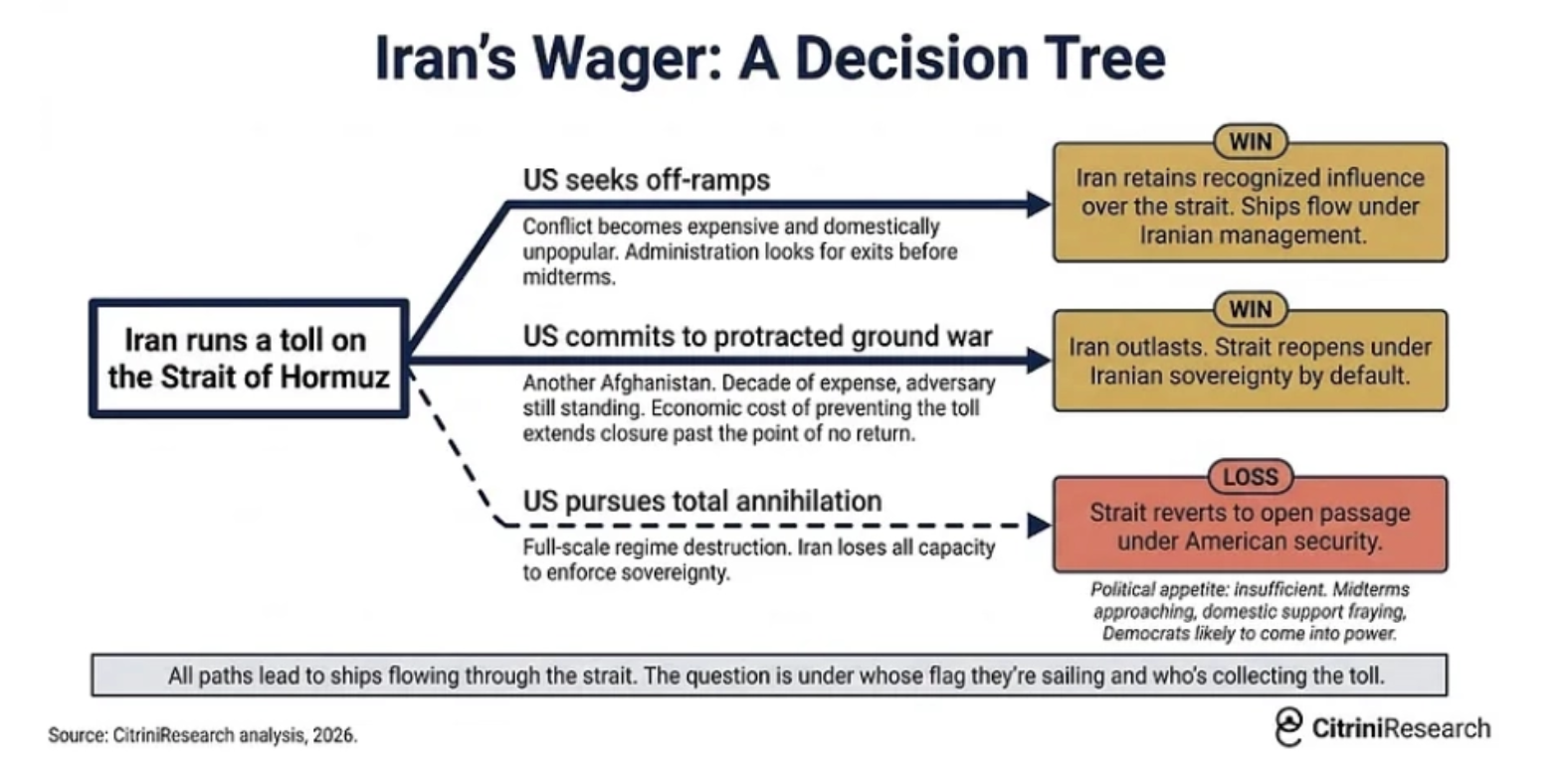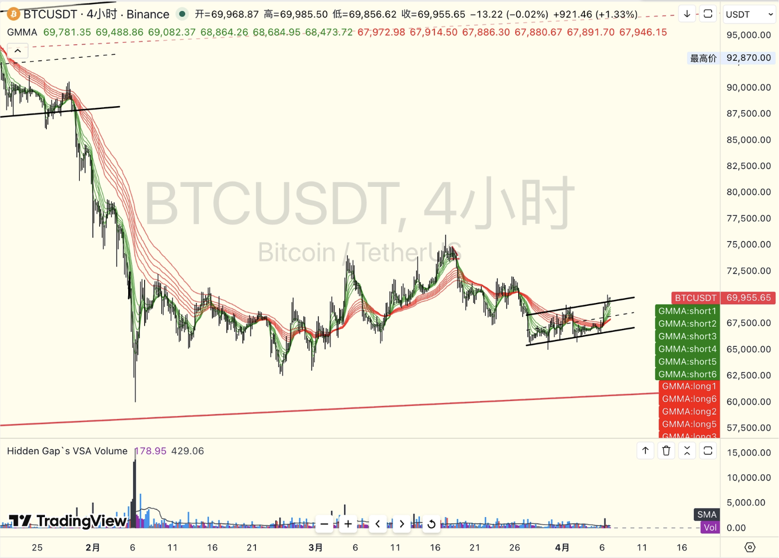 a. 上周对市场判断如果地缘政治情况恶化,币价将会向下看到前低,实际情况上周地缘政治仍然在持续发酵,但仍然没有实际动作,因此币价也是走出了前低后高的行情,短期来看价格仍然受到事件影响巨大,很难在技术层面对价格进行分析,因此只能通过宏观分析。近期纽约的一家投资研究机构 Citrini Research 发布了一篇研报,内容为其研究员以化名身份潜入霍尔木兹海峡考察实际船只航行情况,其中最有价值的地方,不是证明“霍尔木兹已经恢复正常”,而是提示市场:当前真实状态更可能是“有限恢复、选择性放行、伊朗主导的新规则试运行”,而不是媒体口中的“绝对封锁”,根据笔者的目睹,4/2 日便有至少 15 只以上船只通过,他认为伊朗正通过选择性放行、收费、审查、改道”的方式逐步恢复部分通行。对于市场价格而言,伊朗方面预计不会拿霍尔木兹海峡鱼死网破,美国方则希望继续证实其全球性霸权地位,共同点是都不会对油价进行毁灭性打击。从这个角度来看,市场价格,短期仍会保持震荡,但下跌幅度会有限,前低仍然是目前的价格低点。