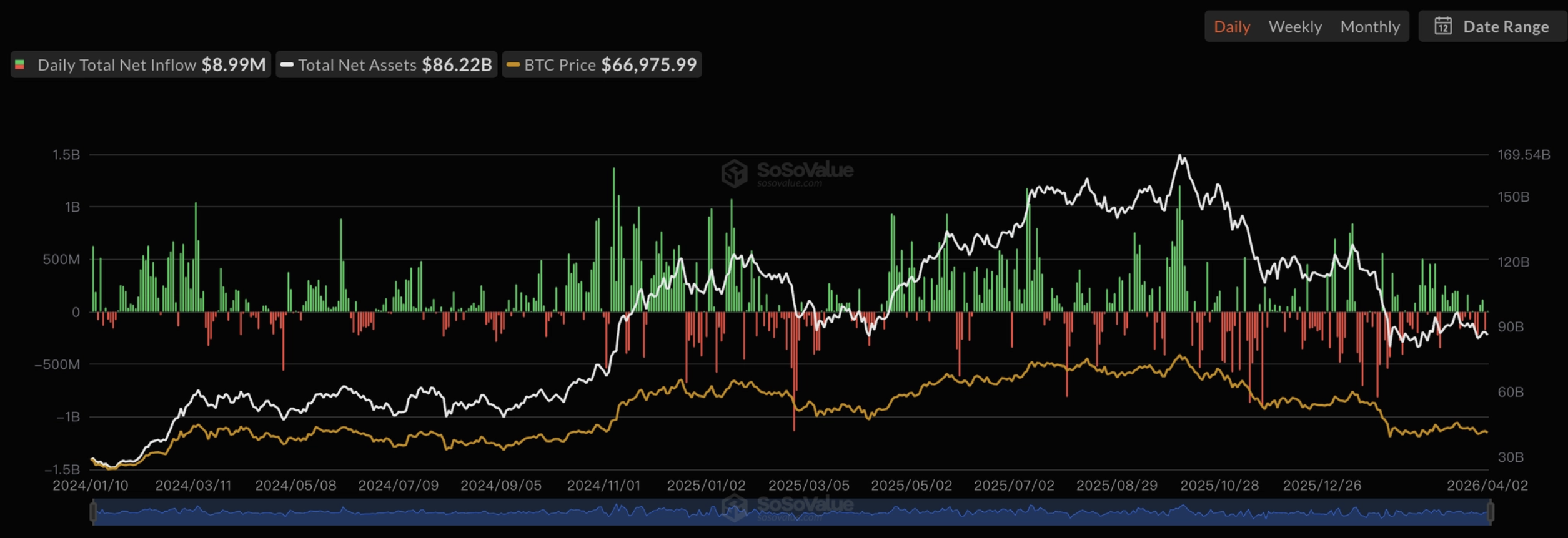 a. 本周市场整体呈现“地缘主导、风险偏好反复”的特征:一方面,美伊冲突相关消息在“可能缓和”与“可能升级”之间来回切换,推动油价维持在 $110/bbl 附近高位、并反复扰动利率与美元预期;路透资金流数据显示,在截至 4/1 的一周里,全球股票基金净流入约 $150.2 亿(延续前一周强流入),但同时债券基金转为净流出约 $195.8 亿、货币市场基金也出现连续第二周净流出约 $169.3 亿,反映资金在“追逐风险资产反弹”与“担忧滞胀 / 政策再转鹰”之间摇摆。 加密端则表现为“波动收敛但脆弱”:BTC 在周初一度回稳并接近 $69k,盘中触发约 $1.46 亿空头清算,但整体仍更像在宏观噪音下的被动跟随(油价、收益率与风险情绪仍是主导因子)。 结构性资金方面,3 月份现货 BTC ETF 出现“月度修复”,媒体统计为约 $13.2 亿净流入(结束此前连续数月净流出),对 BTC 在 $65k–$70k 区间的支撑有所贡献,但在地缘冲突与利率预期仍不稳定的背景下,这类增量更偏“边际托底”而非趋势确认。